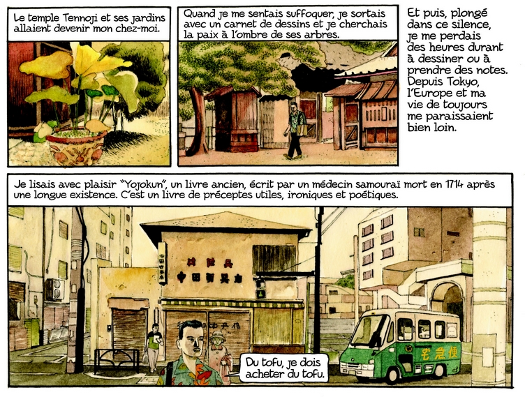 Durant plus de 170 pages, Igort se met en scène, racontant un peu à la manière de Taniguchi, sa vie là-bas, vivant seul dans son petit studio de 14 m2, dessinant sans relâche, jour et nuit, pour satisfaire aux besoins de son éditeur. Entre deux souvenirs, l’auteur évoque la culture du pays, mais aussi son histoire, les récits populaires, et bien sûr quelques grandes figures artistiques du pays. C’est ainsi qu’un fil des pages on croisera Takeshi Kitano, Hokusai, Hiroshige, Otomo, Taniguchi, Miyazaki, Gō Nagai le créateur de Goldorak et même le petit tyrannosaure Gon.