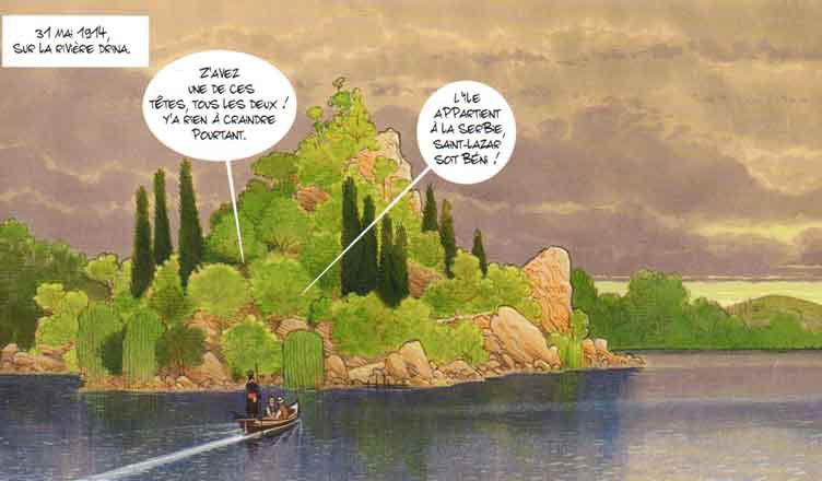 Si l’initiative de Vent d’Ouest est passionnante, que retenir de cette bande dessinée dédié à Gavrilo Princip ? Au fond pas grand-chose par rapport au souvenir que le commun des mortels aura gardé de ses leçons d’Histoire au lycée. Elle consiste à retracer le parcours de l’étudiant nationaliste, depuis le jour où il apprend la venue de l’héritier du trône austro-hongrois en Bosnie jusqu’à l’assassinat de ce dernier. Patriote convaincu, le personnage apparaît plus falot que déterminé, et l’exploration de sa personnalité demeure très superficielle, au même titre que ses complices dont le plus marquant est juste présenté comme le gaffeur de service… De la même façon, la narration, certes objective, consiste en une succession froide et un peu ennuyeuse des allers et venues des protagonistes, matinée d’anecdotes sans grand intérêt.