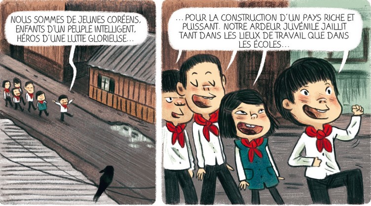 Comme dans la série Marzi, qui racontait la vie en Pologne sous le régime de Jaruzelski vu à travers les yeux d’une petite fille, L’Anniversaire de Kim Jong-il raconte la Corée du Nord là encore dans un récit à hauteur d’enfant, brillamment imaginé par Aurélien Ducoudray, avec moult détails sur la vie quotidienne sur la propagande omniprésente et sur les conditions de vie précaires auxquels doivent faire face la famille de Jun Sang.