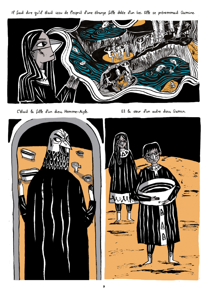 Et comme visiblement Isabel Greenberg raffole du genre, elle a opté pour des contes à tiroirs, faisant ainsi preuve de maîtrise narrative, signe distinctif de tout conteur digne de ce nom. Son trait révèle une certaine gaucherie, qui semble d’ailleurs assumée, laquelle est compensée par une esthétique et des couleurs cohérentes, mais surtout une touche poétique indéniable. Un style qu’on pourrait qualifier de primitivisme moderne, tout en angles, assez austère, accréditant l’idée qu’on n’est pas chez Disney. Définitivement, Greenberg n’a pas destiné ses histoires aux enfants mais plutôt pour un public adulte.