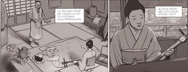 Traiter une BD de “classique” peut sembler dur. Reste qu’il est assez rare que ayant passé un bon moment en compagnie des cases d’une bande dessinée, j’aie envie de creuser la bibliographie ou Google en quête de plus de “matériel” pour documenter une époque. Durieux et Perrissin arrivent à susciter cette envie. J’ai lu plusieurs sites, recherches et études sur Calamity Jane quand j’ai eu découvert Martha Jane Cannary. J’ai envie de creuser le mythe de la Geisha aujourd’hui avec ces deux tomes. J’aime bien aussi quand une BD sert de clé ou de balisage d’une recherche. Geisha ou le jeu du shamisen en fait assurément partie.