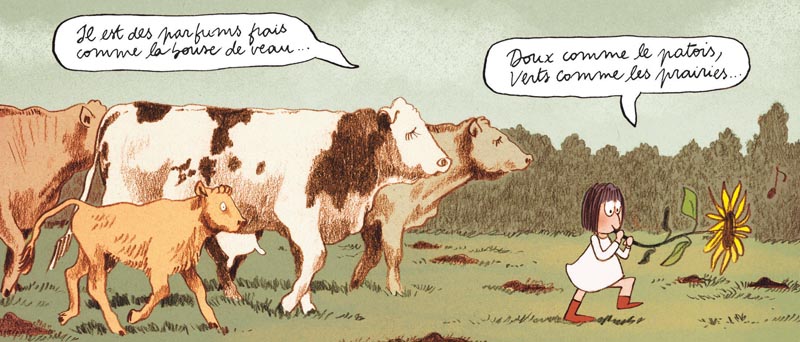 Bien plus qu’un récit linéaire doté d’une logique narrative, ce livre est davantage une promenade champêtre où l’auteure fait jaillir par ci par là des anecdotes amusantes avec l’humour qu’on lui connaît. Amoureuse de littérature, elle y cite ses écrivains favoris, Proust, Loti, Zola, Rabelais… Le virus lui fut transmis par sa mère, qui elle-même avait pris pour habitude de prélever une bouture de rosier ou de plantes diverses en souvenir de chaque maison d’écrivains qu’elle visitait. A coté de ces plaisantes digressions intemporelles, Catherine Meurisse, n’étant évidemment pas du genre à se cacher la tête dans le sable, laisse parfois s’exprimer sa rage de voir cette belle nature abîmée par Monsanto et tous les chantres de l’agriculture industrielle. « Avant, la bouse sentait bon, constate avec colère la mère de l’auteure. Aujourd’hui, elle pue la merde ! Parce que les vaches bouffent de la merde ! »