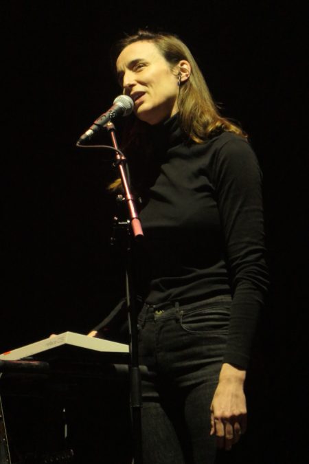 20h : c’est Blumi, c’est-à-dire Emma Broughton, une chanteuse franco-britannique déjà repérée pour sa collaboration avec Bon Iver, qui assure la première partie. Elle commence son set alors que la plupart des gens ne sont pas arrivés, ce qui est loin d’être idéal pour que sa musique crée l’impression voulue (même si elle se dit moins impressionnée parce que tout le monde n’est pas encore là dans cette grande salle !). Blumi chante et raconte des histoires sur un fond sonore bruissant de vie ou sur des sonorités électroniques tantôt liquides, tantôt aériennes. Sa voix, parfaitement posée, impressionne d’emblée par son pouvoir évocateur – on regrettera forcément qu’elle ne chante pas aussi quelques textes en français. A la guitare électrique grondante ou aux claviers, elle cherche, cherche, cherche à créer des sensations suspendues, dans une atmosphère parfois cinématographique. Sur un morceau (The Father ?), le romantisme assez classique de la chanson est déchiré par des bruits incongrus dans la bande son, et l’effet est étonnant. Elle conclut son set de 30 minutes par The Dream, une chanson qu’elle présente comme « de consolation écrite à partir d’événements très tristes ». Et on se dit alors que, oui, c’est bien ça qu’on entend, malgré le handicap de la salle trop grande et du public peu attentif, une musique qui fait du bien à l’âme.