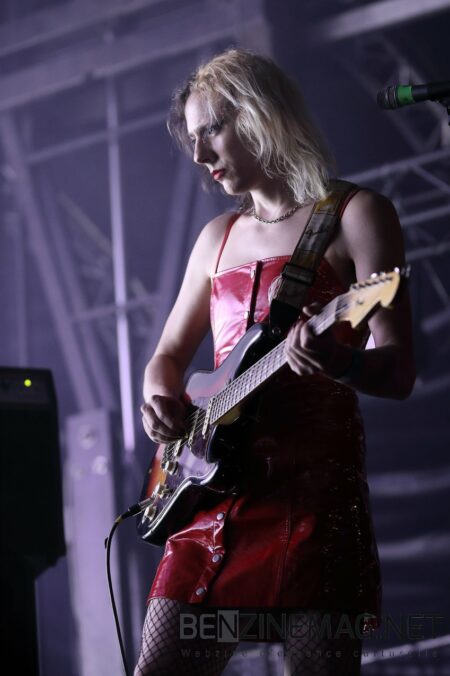 18h25 : Quand on ne peut pas espérer triompher sur le plan musical, on peut toujours tenter de marquer au fer rouge la mémoire des festivaliers en jouant la carte de l’originalité scénique (enfin, on dit « scénique », mais quasiment tout le set des Lambrini Girls s’est passé au milieu du public !). C’est ce que nous démontre le trio punk militant LGBT+, trois jeunes femmes anglaises (pardon pour la qualification genrée !) qui n’ont pas froid aux yeux. Dès leur entrée en scène provocatrice, on sait qu’on aura plus affaire à de l’activisme politique qu’à un vrai concert punk, mais on ne s’attendait pas à ce que la chanteuse se lance immédiatement dans la foule, pour nous faire nous asseoir et nous lever selon son bon vouloir, à nous réquisitionner pour tenir son micro, sa guitare ou même la tenir sur nos épaules au milieu du mosh pit qu’elle gère à sa guise. Sans parler de nous faire clamer individuellement que nous sommes des « gay legends ». On appréciera leur chanson anti-trans haters, qui nous donne l’occasion de brailler : « Fuck J.K. Rowling ! », ou encore un lads lads lads où nous crierons « Fuck the Prince ! ». Signalons que la chanteuse terminera le set en sous-vêtements, avec une spontanéité qui fait vraiment plaisir à voir. Les Lambrini Girls sont radicales, mais sont aussi vivantes et drôles, et on les remercie pour ça ! Elles gagnent aisément la palme du Jour 1 du « groupe le plus photographié ». Pour la musique, on l’a compris, c’était moins convaincant…