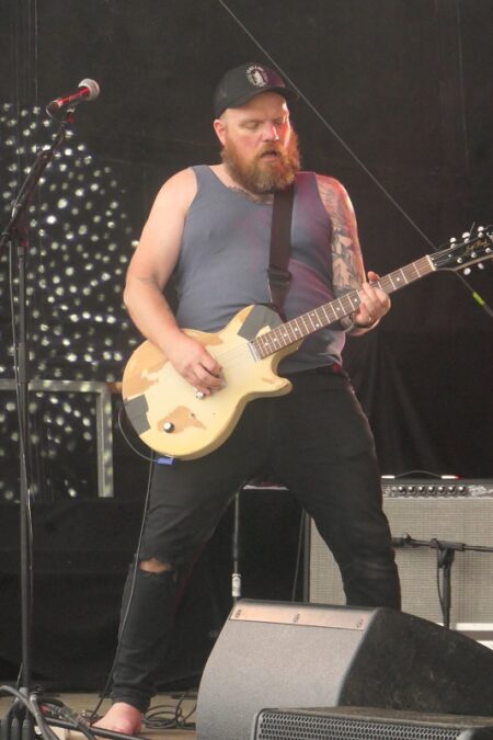 19h30 : dans le nom du festival, il y a blues, et c’est à Shake It Like A Caveman qu’incombe la responsabilité de représenter le blues ! L’homme-orchestre australien a heureusement toutes les compétences pour le faire : une excellente voix, une versatilité indéniable dans son jeu de guitare, et un look parfait. On est un peu surpris quand il attaque son set par une reprise du Floyd, mais pourquoi pas ? Plus loin, on aura droit à une très bonne interprétation de Tom Petty, et à une version heavy de Rebel Rebel de Bowie… Même si c’est dans le registre du blues plus roots qu’on le préfère, avec par exemple une délicieuse partie de slide guitar sur un blues du Mississipi… Il nous offre aussi funky party à l’orgue saturée irrésistible… et un final blues rock particulièrement enlevé, qui soulève l’enthousiasme général. Palme de la sympathie et du plaisir pour cette première journée, et la preuve qu’on peut faire un petit triomphe en restant simple et efficace !