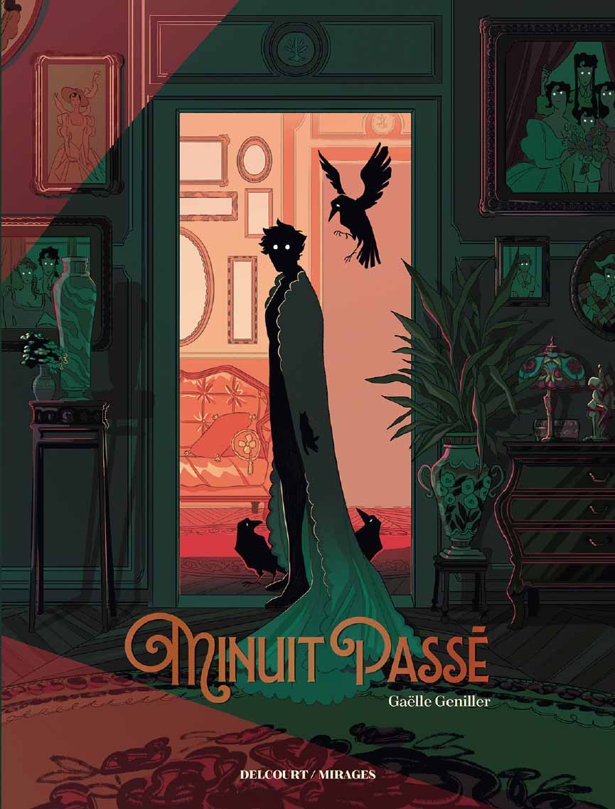 Avec Minuit passé, ce n’est pas tant la narration qui marquera le lecteur que la sensation éthérée qui s’en dégage, car il faut l’avouer, les plus impatients risquent de ne point y trouver leur compte. Le livre se déguste à la façon d’un scone qu’on prendrait à l’heure du thé dans un salon anglais, et sans risque de trouver de l’arsenic dans sa tasse. Ainsi se décrit l’univers de Gaëlle Geniller, un univers aimable et chatoyant, sorte de cocon étranger à la violence du monde. Certains esprits chagrins le déploreront peut-être, mais il sera difficile pour toute âme amoureuse du beau de résister au charme de ce que l’on pourrait qualifier d’oasis graphique. On notera pour terminer le travail éditorial, assez rare faut-il le préciser, sur les tranches de l’ouvrage agrémentées de jolis motifs floraux aux tonalités vertes. Un raffinement jusqu’au bout de l’objet, et un argument de plus en faveur du livre imprimé… Et pour prolonger l’enchantement, l’autrice « ouvre les rideaux » en fin d’ouvrage pour nous offrir un portfolio comprenant moult portraits de son cher Guerlain, paré des vêtements les plus élégants, mais de Nisse aussi, des croquis divers d’autres personnages, ainsi que des plans du manoir…