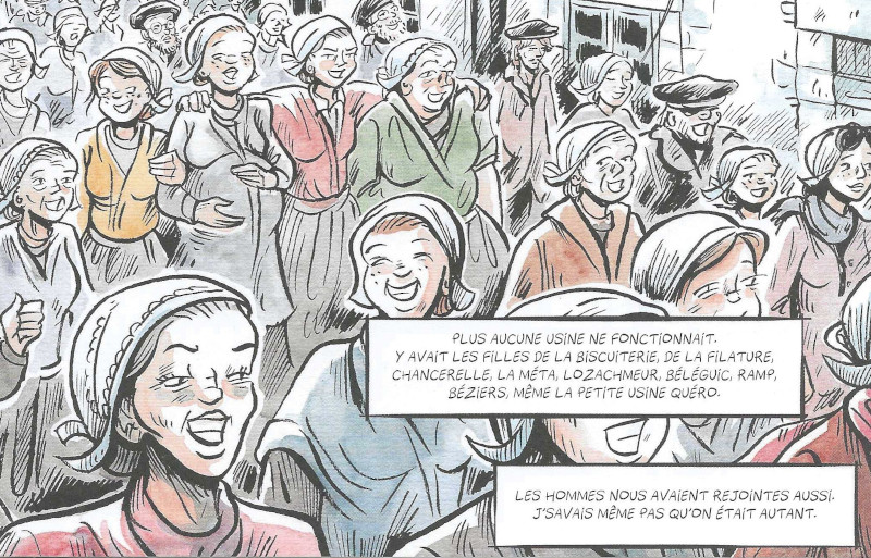 La construction du scénario du Chœur des sardinières est, évidemment, resserrée sur les personnages d’une famille, trois générations de femmes qui évoluent de la crainte et la soumission au désir de changer le monde, en passant par le simple souhait d’une vie meilleure. Il s’agit là d’une technique « classique » aidant l’identification du lecteur, mais dont Touitou n’abuse pas, prenant toujours soin d’élargir son récit à la population entière des « sardinières ». Et, même si l’on regrettera que le dessin de Lewko ne permette pas toujours de reconnaître facilement toutes les protagonistes, on peut à l’inverse trouver que cette « uniformité » des silhouettes, des vêtements, des visages mêmes (usés par une vie tellement dure) est tout à fait cohérente avec la réalité des choses. Vous irez rechercher ensuite des photos de ces « évènements », et vous réaliserez combien, en effet, ces femmes se ressemblent toutes.