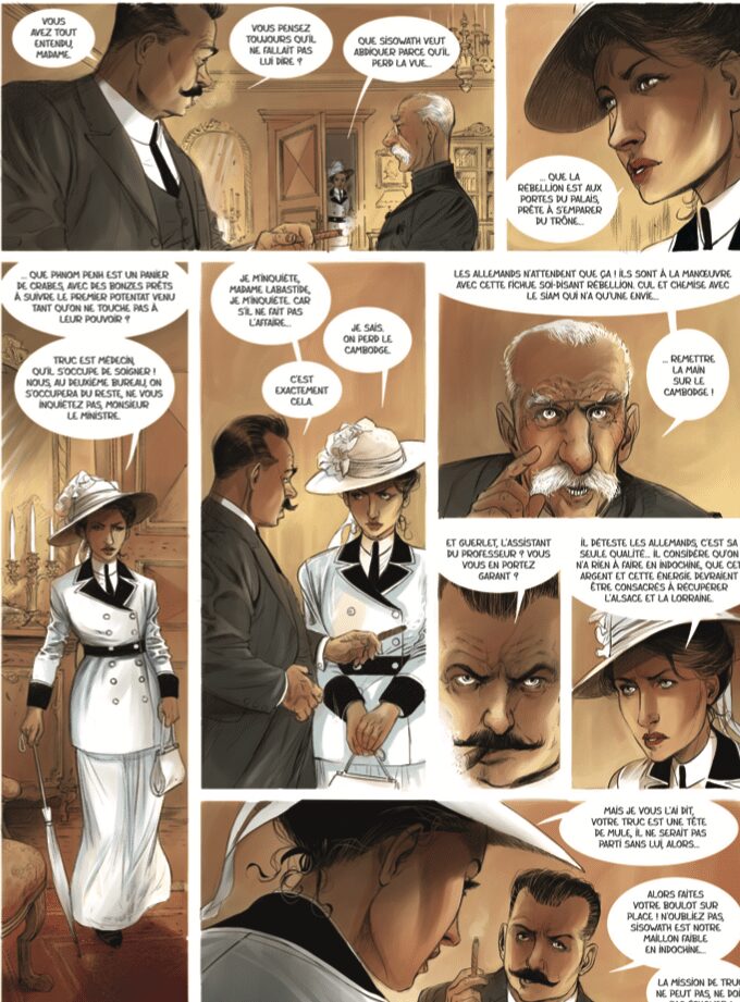 Le scénario imaginé par les cousins Truc est captivant : s’appuyant largement sur les mémoires de leur arrière-grand-père, l’intrigue mêle habilement faits véridiques et roman d’espionnage. Il ne s’agit pas d’un simple album de Tintin au Cambodge et on apprend ainsi plein de choses sur la présence française en Indochine, entre ces deux guerres avec l’Allemagne, celle de 1870 et celle de 1914 à venir. L’album comporte d’ailleurs un excellent dossier qui éclaire les différents points de l’affaire, photos d’époque à l’appui.
