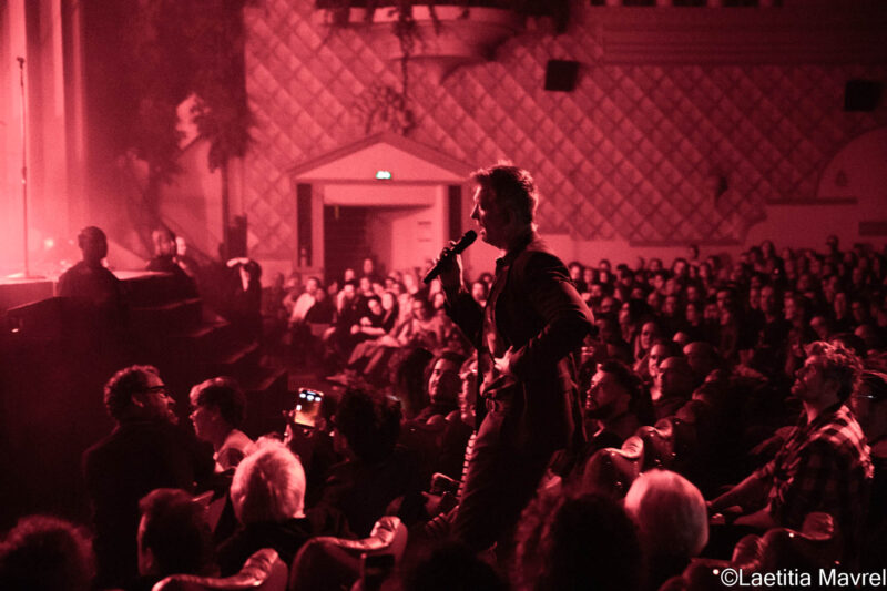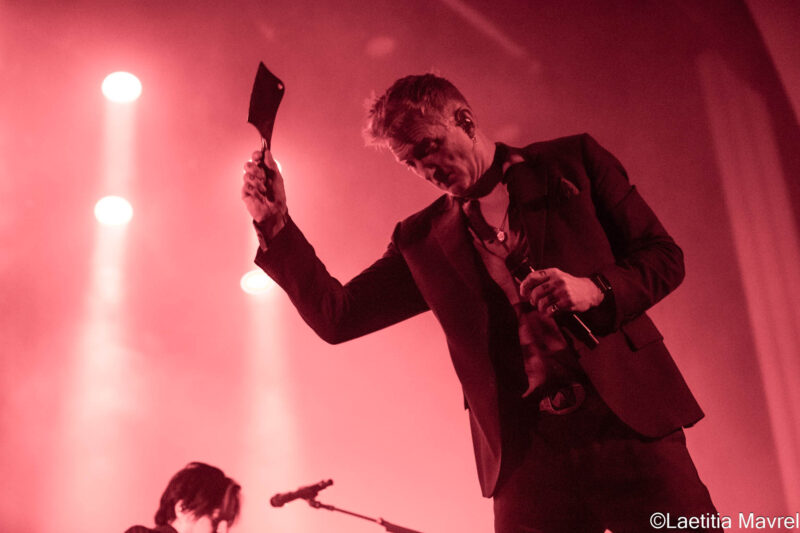 Ainsi, nous l’observerons de nos confortables sièges en cuir consécutivement passer de la scène à la fosse assise, allant jusqu’à monter dans des balcons du théâtre normalement inaccessibles pour s’y poster tel un Roméo qui vient déclarer sa sérénade à Juliette, ici le public parisien. Sur scène, entre verres de vin rouge et cigarettes dont il nous rappelle toujours extrêmement sympathiquement malgré l’interdiction de fumer indoor que « ça n’est qu’une taff, Motherfuckers », Josh Homme s’exécute de façon envoutée. Ses manières sont à la limite du théâtral : Josh chante et danse lascivement, s’éclaire d’une seule lampe torche dans la quasi-pénombre pour les premiers titres tout en acoustique, s’arme d’une feuille de boucher en jonglant nonchalamment avec sur Mosquito Song, alors baigné dans une lumière rouge sang opaque et aveuglante, ou vient embrasser littéralement certain membre du public, rappelant durant les interludes que ce qui le lie à Paris est unique et indestructible.