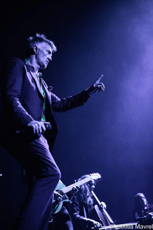 C’est dans un Grand Rex complet, du rez-de chaussé jusqu’au plus haut balcon, que nous retrouvons le groupe, toujours composé de Josh Homme, Troy Van Leeuwen, Michael Shuman, Dean Fertita et Jon Theodore. Ce soir, la formation sera complétée de musiciens aux violons, aux cuivres et mené par un chef d’orchestre, offrant au répertoire de Queens Of The Stone Age une intensité d’un autre genre. Le concert se voit segmenté en trois parties : la première avec les titres de l’EP Alive In The Catacombs joués en acoustique avec les violons, puis suivent un second et troisième set qui offrent une revisite de titres qui pioche de façon très vaste dans le répertoire du groupe. Évitant de tomber dans la facilité de la setlist Best-Of, comme nous avons pu déjà en profiter lors de la clôture du festival Rock en Seine en août dernier, le choix se porte sur des morceaux qui se voient bonifiés par la nouvelle orchestration. La lenteur et la puissance sont de mises, un paysage sonore qui offre le parfait écrin pour que puisse s’épanouir le nouveau visage de Josh Homme en 2025. Vêtu d’un costume aubergine et d’une chemise noire ornée de fleurs, la houppette ayant laissé place à une coupe plus sophistiquée mettant en valeur les tempes nouvellement grisonnantes de notre ami, le style se veut indéniablement élégant et séduisant. A cinquante-deux ans maintenant, l’époque des tee-shirts sans manches et autres looks plus grunge semble oubliée. Cependant, le style s’est assagi mais pas l’esprit, toujours à la limite du borderline, qui représente son l’essence même.