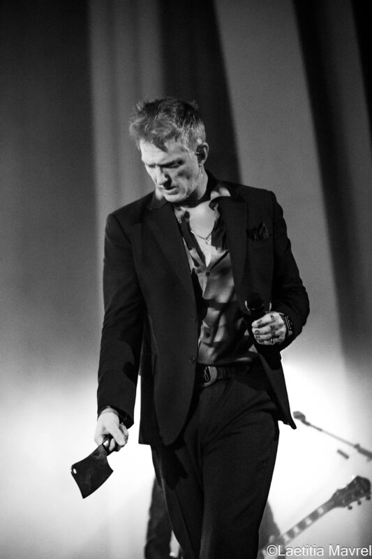 Ainsi, nous l’observerons de nos confortables sièges en cuir consécutivement passer de la scène à la fosse assise, allant jusqu’à monter dans des balcons du théâtre normalement inaccessibles pour s’y poster tel un Roméo qui vient déclarer sa sérénade à Juliette, ici le public parisien. Sur scène, entre verres de vin rouge et cigarettes dont il nous rappelle toujours extrêmement sympathiquement malgré l’interdiction de fumer indoor que « ça n’est qu’une taff, Motherfuckers », Josh Homme s’exécute de façon envoutée. Ses manières sont à la limite du théâtral : Josh chante et danse lascivement, s’éclaire d’une seule lampe torche dans la quasi-pénombre pour les premiers titres tout en acoustique, s’arme d’une feuille de boucher en jonglant nonchalamment avec sur Mosquito Song, alors baigné dans une lumière rouge sang opaque et aveuglante, ou vient embrasser littéralement certain membre du public, rappelant durant les interludes que ce qui le lie à Paris est unique et indestructible.