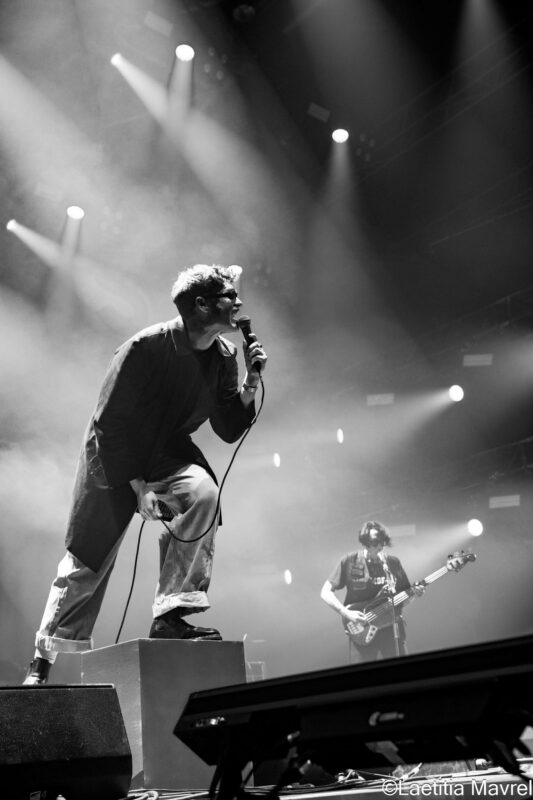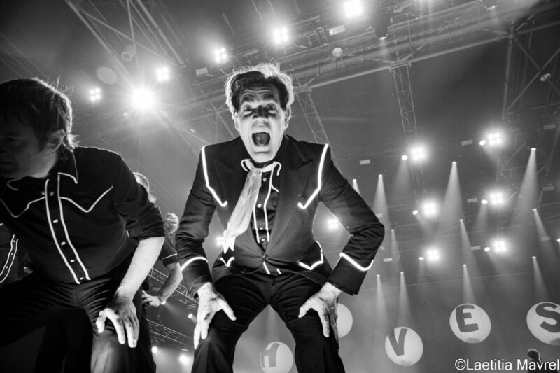 Ce soir, The Hives voient grand pour nos retrouvailles. C’est en effet un Zénith finalement bâché au dernier quart qui accueille les spectateurs, mais cela passera totalement inaperçu tant la température sera à son maximum toute la soirée. Nous avons droit à une entrée en matière de haute volée avec Yard Act en seconde première partie (le groupe ayant entamé les hostilités en tout début de soirée, Spiritual Cramps, nous ayant fait l’effet d’un mauvais tribute band dédiés aux héros du jour). Yard Act viennent de Leeds, ont à leur actif deux albums brillants, The Overload et Where’s My Utopia?, entre post punk et art rock. Ils ont eux aussi un leader charismatique en la personne de James Smith, chanteur sans guitare au spoken word iconique, dont les textes pisse-vinaigre et remplis d’humour noir collent parfaitement à la personnalité de The Hives. En seulement trente minutes, nous replongeons dans leur univers fait de guitares saturées et d’une ligne de basse dévastatrice qui permettent un mariage habile de sensations punk teintées d’une dose de beats groovy tellement addictifs. Pas impressionné pour un sou, James Smith remportera haut la main le défi qu’impose d’être un support band : les néophytes sont conquis et les fans déjà acquis à leur cause sauront rendre la pareille lorsque James viendra les chercher au plus près. Trente minutes qui passent trop vite, et l’envie déjà pressante de retrouver Yard Act l’an prochain avec leur troisième album, en ce moment même en préparation.
