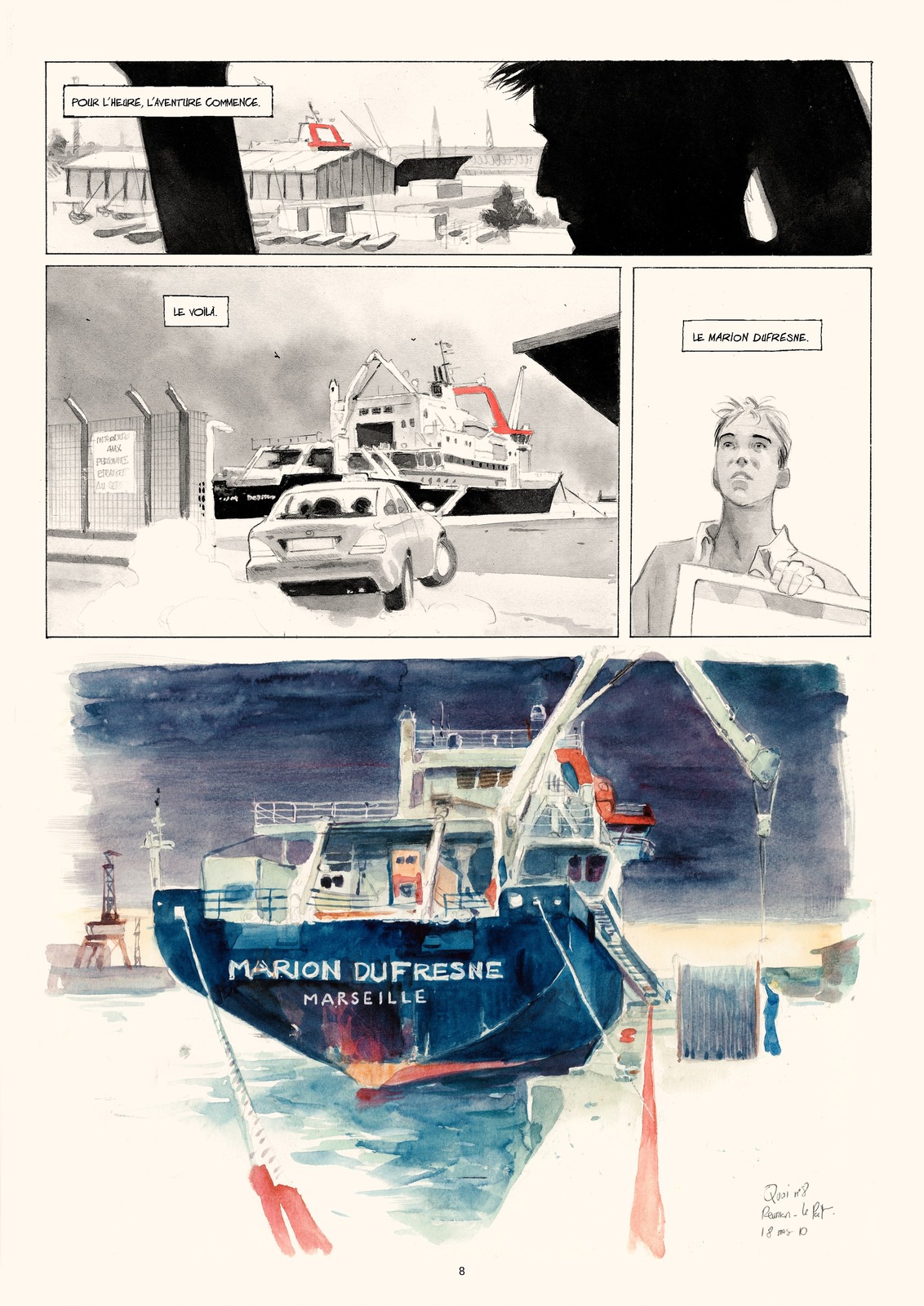 L’auteur embarque sur le ravitailleur Marion Dufresne pour une ‘rotation‘ avec les chercheurs de l’IPEV, l’Institut Paul Emile Victor, l’institut polaire français, quelques cinéastes et photographes. Et le lecteur prend la mer avec lui pour « les Terres Australes : Crozet, Amsterdam, Saint-Paul… Kerguelen. Enfin, jadis surnommées les Îles de la Désolation ».