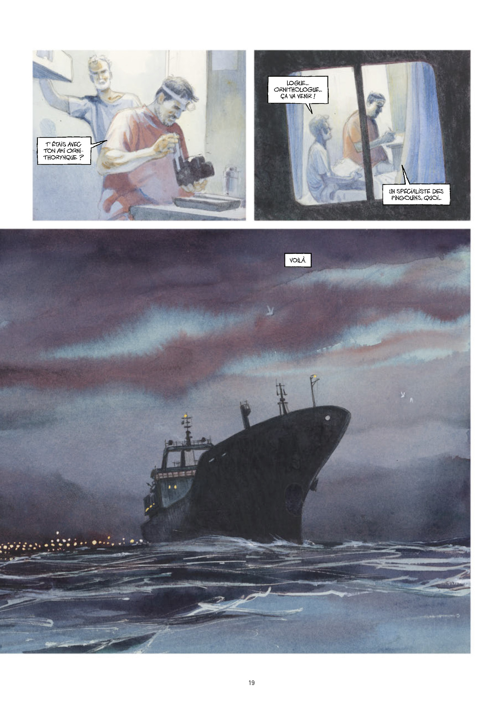 Heureusement pour nous, Lepage a fini par embarquer de nouveau sur le mythique Marion Dufresne, le bateau ravitailleur des TAAF, qui navigue désormais pour le compte de l’IFREMER. Il accompagne une mission popéléph concernant la population des éléphants de mer avec une équipe chargée d’un reportage TV et compte rester quelque temps sur l’île : un mois seulement, et en été ! Sur le bateau, sur les îles, il retrouve d’anciennes connaissances et fait de nouvelles rencontres : de nombreux scientifiques de toutes sortes, des logisticiens, des ouvriers, des militaires, des marins… chacun avec son histoire, son chemin, sa quête. C’est ce microcosme qui va nourrir son ouvrage et notre lecture : « J’ai envie de raconter les personnes que je rencontre, dans leur complexité. » Des rencontres, des gens « qui donnent foi en l’humanité » : et en ces temps troublés, ce sont quelques images (et quelques mots) qui font du bien.