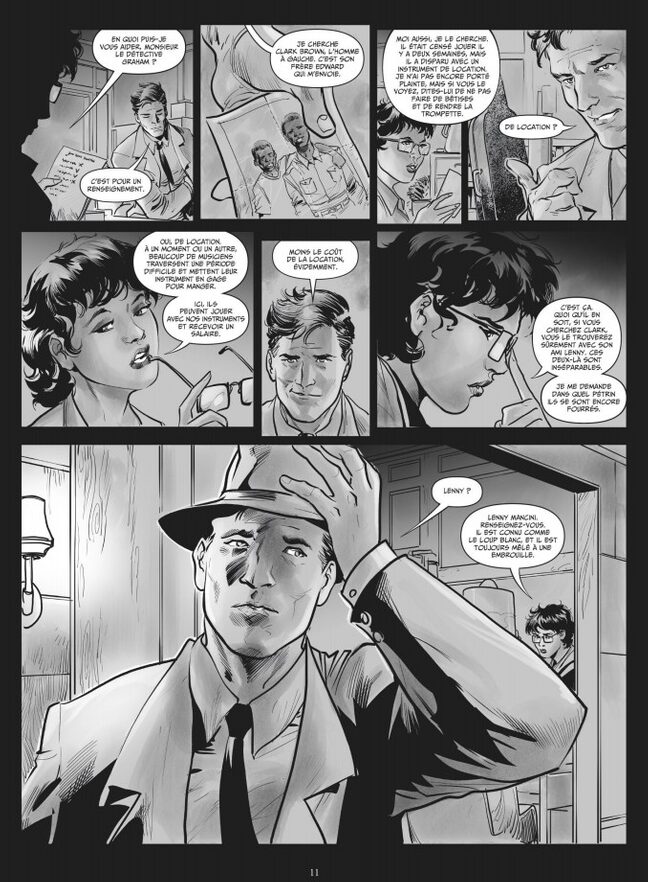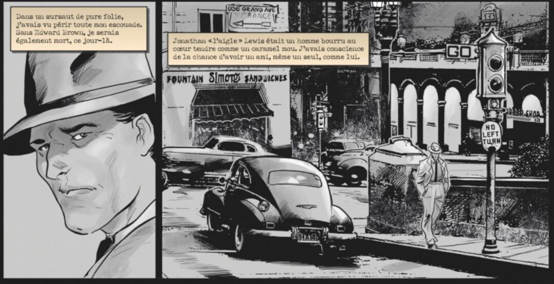 L’auteur nous dit également avoir réalisé un gros travail de documentation pour reconstituer les rues, les bâtiments, les costumes, les voitures, des années 40-50. Il s’est toutefois permis quelques libertés historiques comme ce couple mixte en noir et blanc (ah, ah) chose impensable à l’époque où les blacks n’avaient pas encore leur place, même au retour de la guerre.